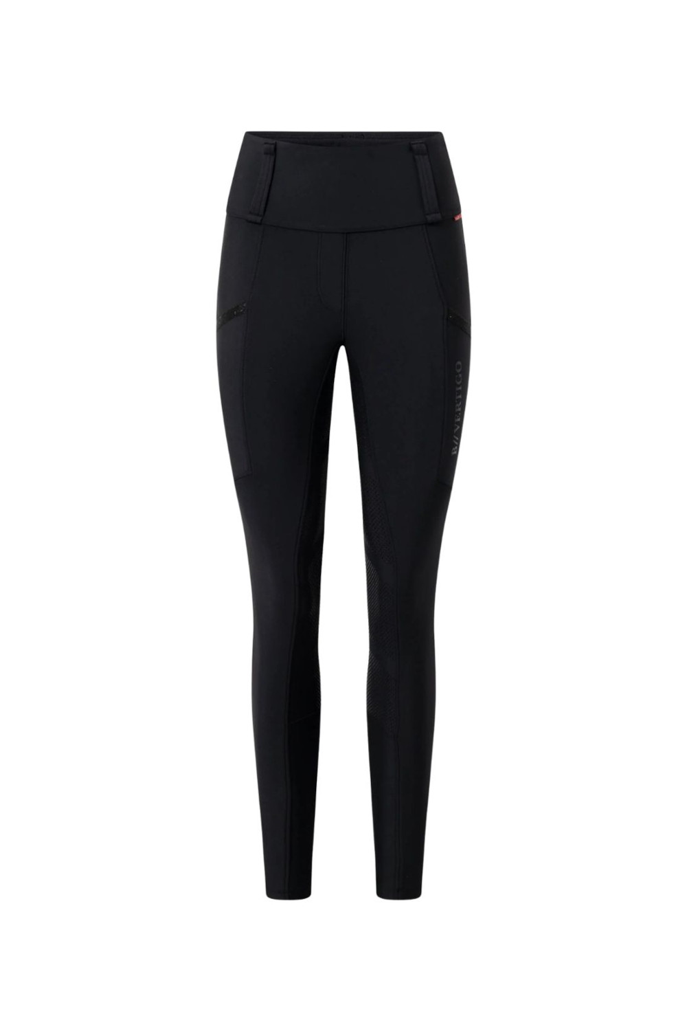 Legginsy jeździeckie z pełnym lejem silikonowym, wykonane z elastycznego materiału o właściwościach kompresyjnych. Zapewniają dopasowanie do sylwetki, stabilność w siodle oraz wygodę podczas jazdy, szczególnie w cieplejsze dni. Wysoki stan dobrze utrzymuje legginsy na miejscu i podkreśla talię. Oddychająca tkanina wspiera komfort podczas treningu, a silikonowy lej zwiększa przyczepność. Model wykończony subtelnymi, błyszczącymi detalami. Kieszenie na udach z silikonowym nadrukiem logo umożliwiają bezpieczne przechowywanie telefonu. Imitacja tylnych kieszeni oraz szlufki na pasek nadają klasyczny wygląd.
