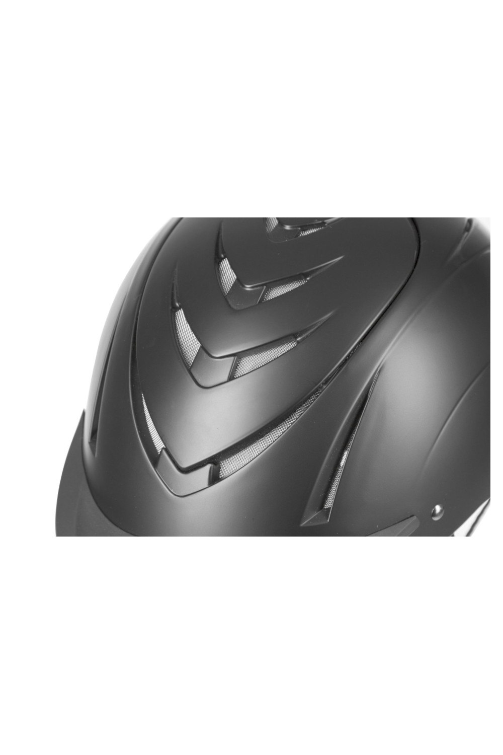 Elegancki kask jeździecki w wyszukanej czerni, łączący nowoczesny design z wysokim poziomem bezpieczeństwa. Aerodynamiczny profil i elastyczny daszek zapewniają komfort jazdy, a system Disc umożliwia precyzyjne dopasowanie rozmiaru jedną ręką. Regulacja wysokości pierścienia z tyłu głowy pozwala na idealne ustawienie kasku, a skuteczny system wentylacji z moskitierami dba o świeżość i ochronę przed owadami.