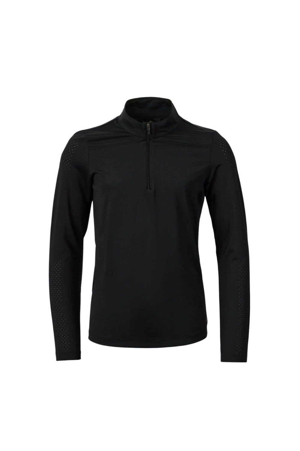 Koszulka treningowa dla młodszych jeźdźców, wykonana z lekkiego, oddychającego i szybkoschnącego materiału. Zapewnia komfort podczas jazdy i treningów, również w cieplejsze dni. Perforowane obszary na plecach i ramionach wspierają cyrkulację powietrza oraz pomagają skutecznie odprowadzać wilgoć. Elastyczna tkanina dopasowuje się do sylwetki, nie ograniczając ruchów. Stójka nadaje sportowy, schludny wygląd, a zamek błyskawiczny z przodu umożliwia regulację wentylacji.