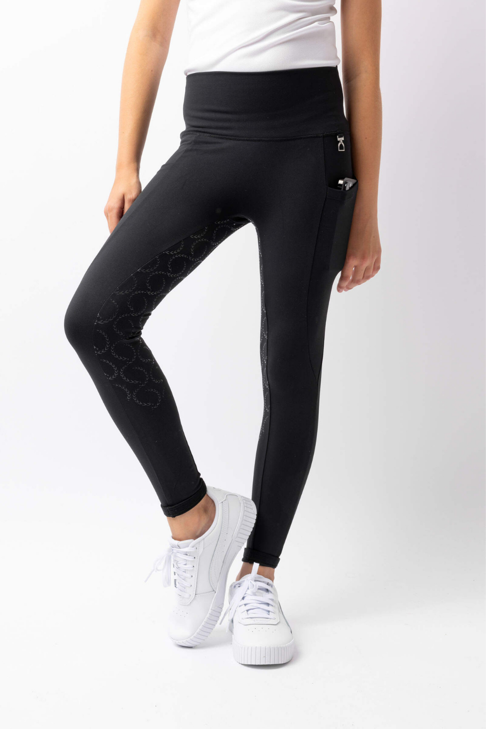 Legginsy dziecięce Gillian zostały zaprojektowane z myślą o komforcie i technicznym wsparciu młodych jeźdźców. Kompresyjny, oddychający materiał zapewnia stabilizację nóg i optymalne dopasowanie podczas jazdy konnej. Wysoki stan utrzymuje legginsy na miejscu, a elastyczna konstrukcja nie krępuje ruchów. Pełny lej silikonowy zapewnia lepszą przyczepność w siodle, co zwiększa pewność i bezpieczeństwo podczas jazdy. Dwie funkcjonalne kieszenie na udach pomieszczą najpotrzebniejsze drobiazgi.