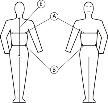 | Rozmiar | Wzrost | A-Obwód klatki piersiowej | B-Obwód talii | E-Długość tyłu kamizelki ochronnej |