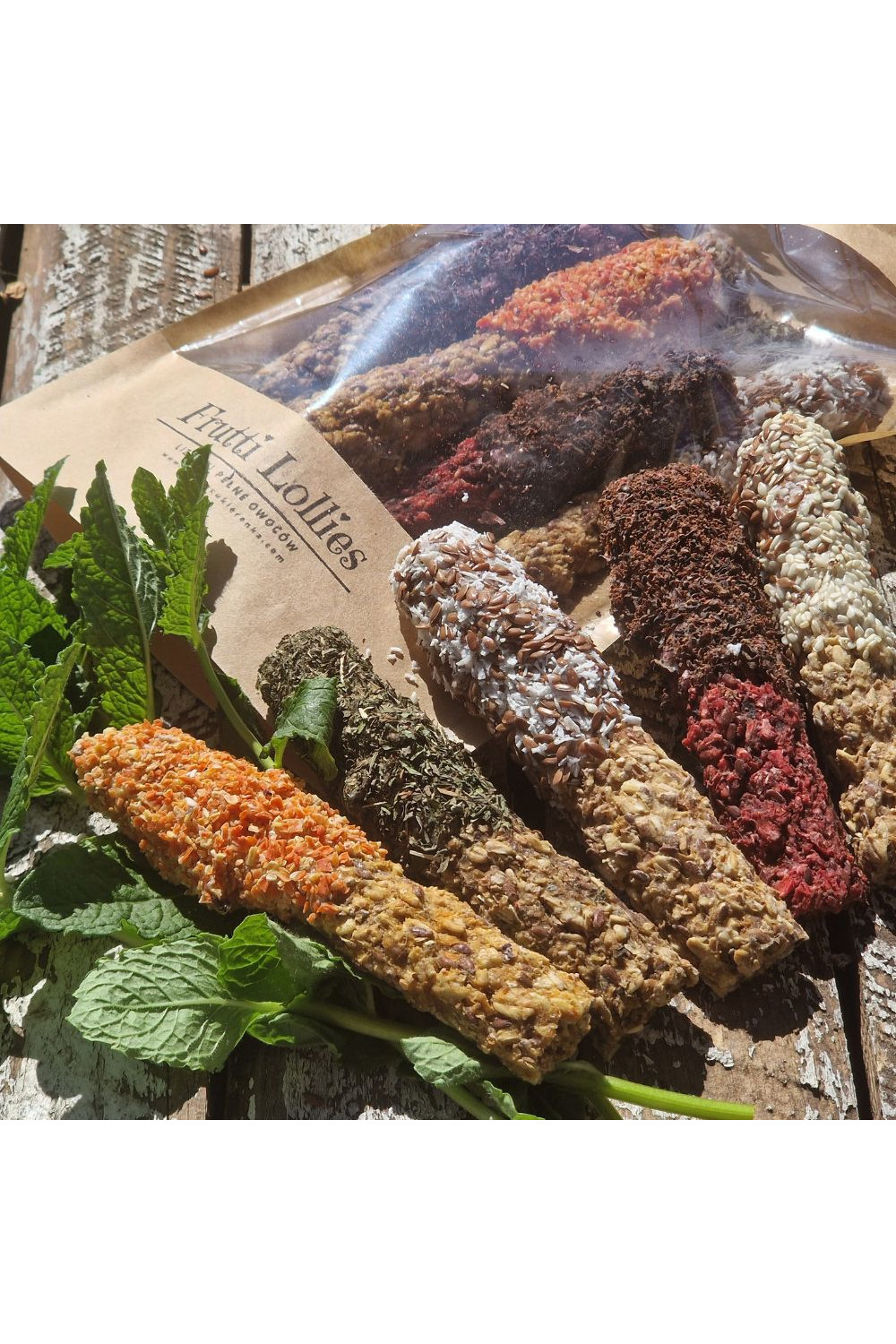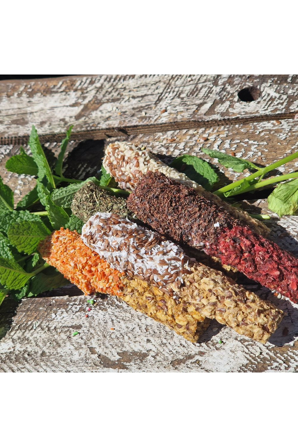 Dodatki i posypki: sezam, wiórki kokosowe, czarnuszka, dodatkowe siemię lniane, mięta, aronia, malina suszona, truskawka suszona, porzeczka suszona, lawenda, marchew