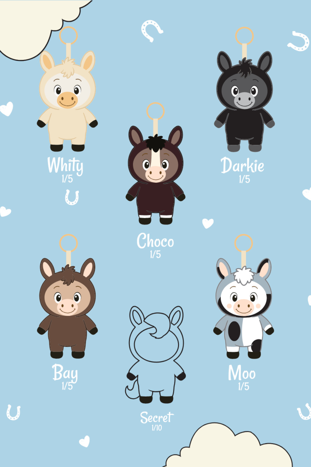 W serii dostępnych jest pięć podstawowych koników: Whity, Darkie, Choco, Bay oraz Moo, a także jeden wyjątkowy, tajemniczy konik Secret, którego wygląd poznasz dopiero po otwarciu opakowania. Kolory wszystkich postaci są zaprezentowane na pudełku, jednak zawartość pozostaje niespodzianką aż do momentu otwarcia.