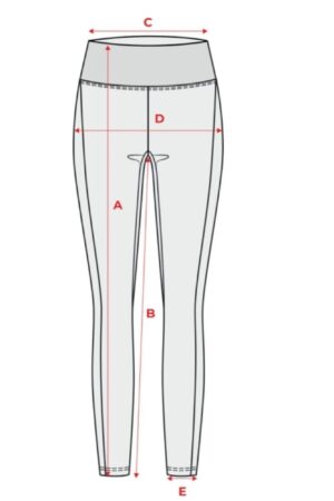 | Rozmiar | A - Dł. całkowita | B - Dł. wew. nogawki | C - Szer. w pasie | D - Szer. bioder | E - Szer. nogawki |