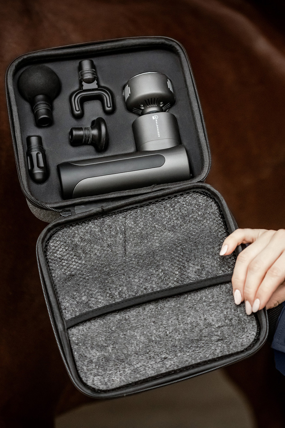 Model wyposażony jest w 5 wymiennych końcówek, które umożliwiają zarówno punktowe, jak i powierzchniowe działanie na różne partie mięśni. Dzięki regulacji prędkości wibracji można indywidualnie dopasować intensywność masażu do potrzeb konia – zarówno przed treningiem, jak i po wysiłku.